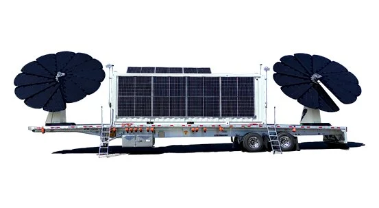 Base camp power is delivered by the Mobile Energy Command - Solar (MEC-S). This 53-foot mobile power system features a control enclosure lined with high-density solar panels combined with “follow-the-sun” Smart flowers on each side to collectively deliver 50 KW of peak power for the base camp. That’s enough power for 6-8 homes per day!.